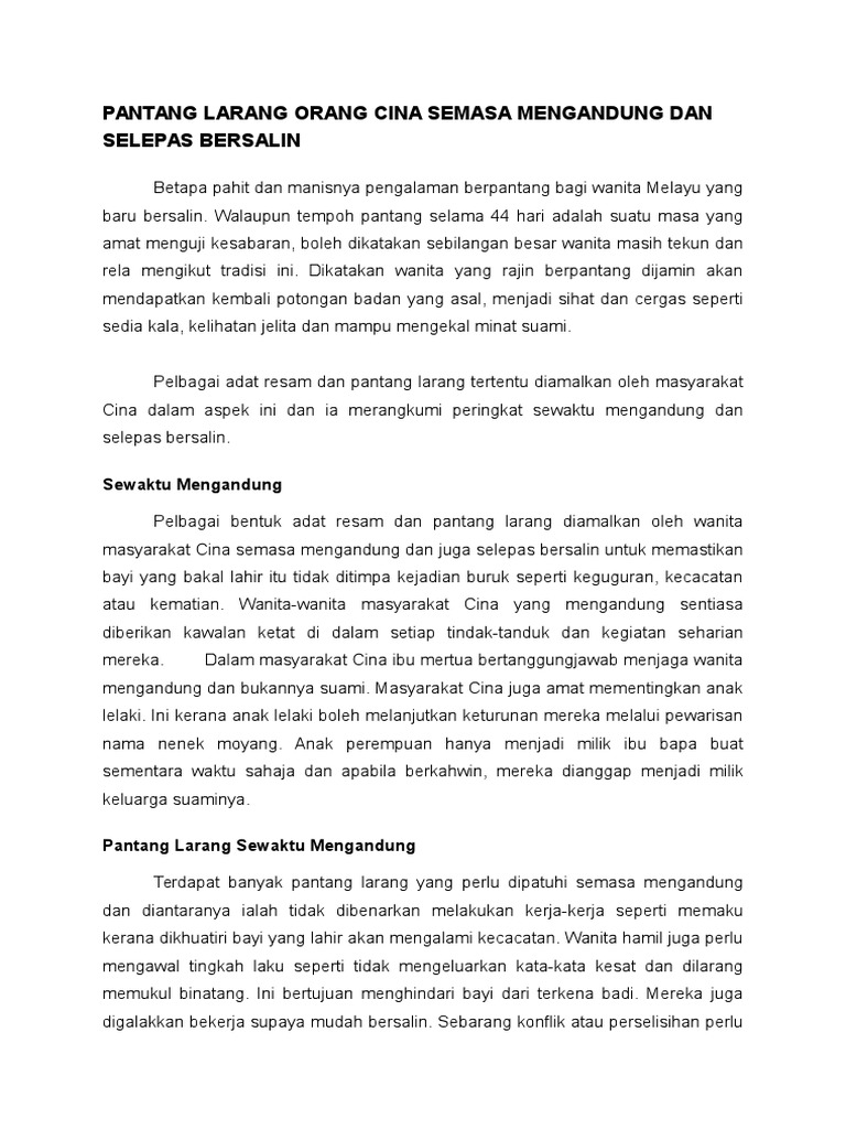 Pantang Larang Kaum Cina Selepas Bersalin